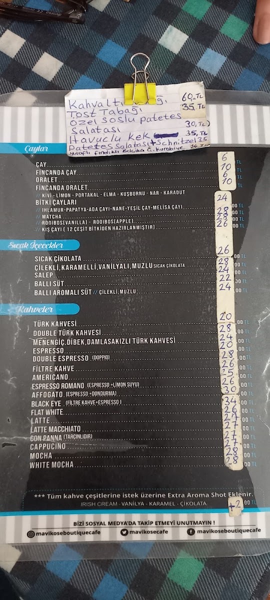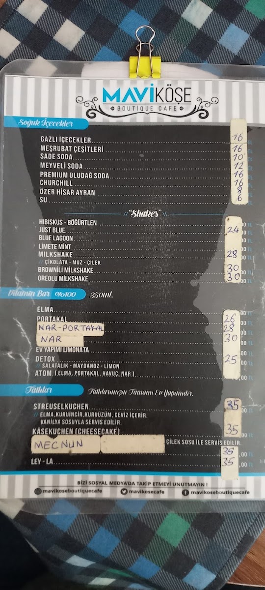 The menu at Mavi Köşe Boutique Cafe offers a selection primarily focused on traditional and local cafe staples suitable for breakfast, light meals, and coffee breaks. Visitors can find a variety of hot beverages, including different styles of Turkish coffee and a range of teas.